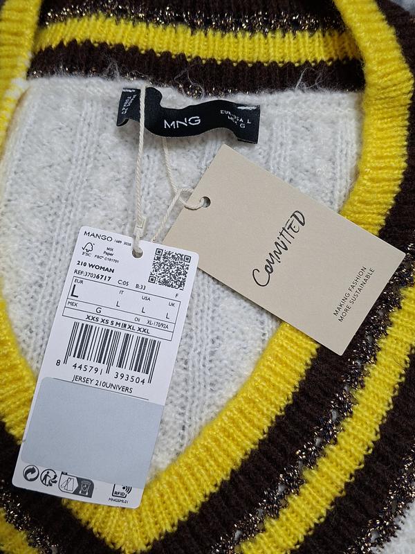 Стильный джемпер Mango «Committed» (Коллекция Univers) Продам новый джемпер от известного бренда Mango. Очень мягкий, уютный и эффектный вид благодаря сочетанию цветов и золотистому мерцанию. 📋 Характеристики: Бренд: Mango (MNG). Состояние: Новый, со всеми этикетками (сток/новая вещь). Размер: L (подойдет также на M в качестве оверсайза). EUR/USA: L | MEX: G Состав: Серия Committed (изготовлено из экологических материалов). Ткань с добавлением люрекса (золотовая нить), красиво переливающаяся на свету. Дизайн: V-образный вырез, белый основной цвет с ярко-желтыми и шоколадными полосками. ✨ Особенности: Модель Jersey 210 Univers - актуальный препи-стиль. Очень приятный к телу, не «кусается». Идеально сочетается с джинсами, кожаными брюками или юбками меди.