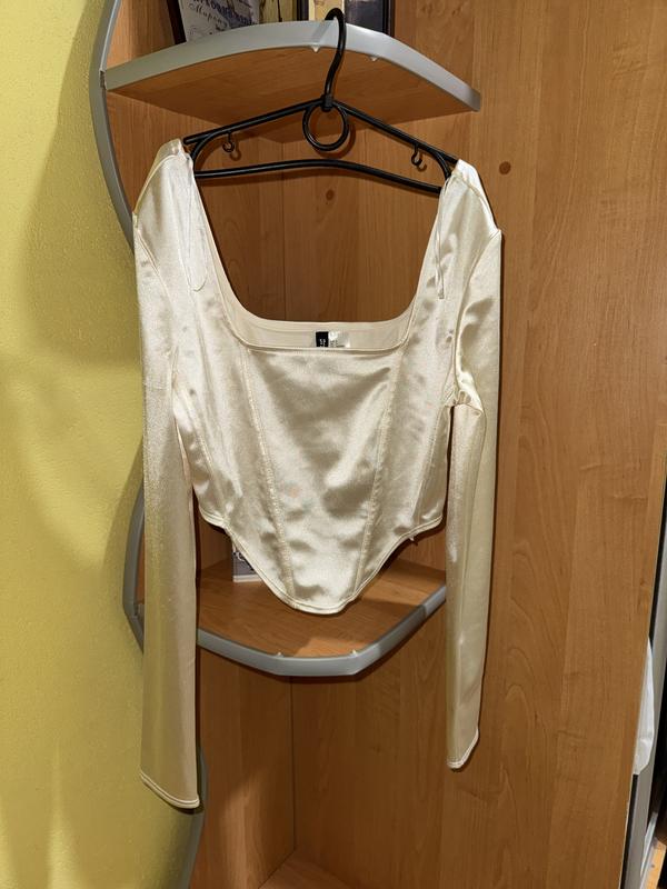 В гарному стані,розмір xs-s, ніби перламутрова,з імітацією корсету,є трішки «затяжок» на фото видно