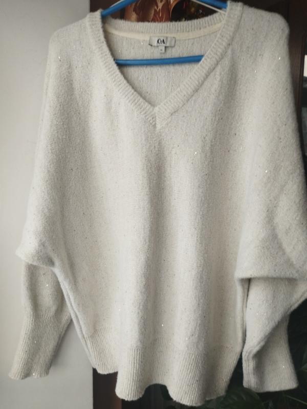 Джемпер в состоянии нового.Размер на этикетке XL, идёт на 52-54. Состав полиэстер с добавкой 14% хлопка, с вкраплением золотистого люрекса. ОГ 120,талия 110,рукав летучая мышь от выреза 75, длина 75. Цвет топленого молока. Плотность осень, зима.