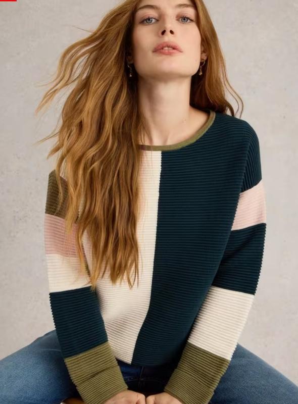 Очень красивый джемпер в рубчик, имеет контрастный дизайн и полосатые рукава с подвернутыми манжетами, круглый вырез. Дл. 63- 66, пог.56, рук. 60.Материал хлопок.