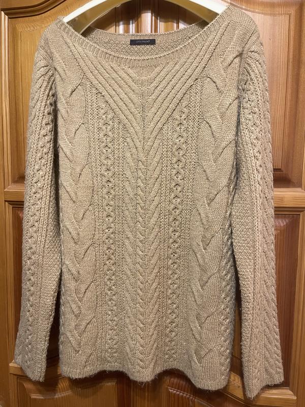 Свитер-джемпер красивого бежевого цвета, размер s-m. Пряжа на свитере : полиестер с добавлением шерсти, состав нити точно не известен, бирка с составом срезана. Длина свитера 67 см, ширина 55 см, длина рукава 68 см, свитер еще тянется.