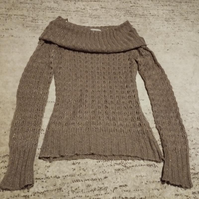 Замечательный свитерик коричневого цвета размера S. Круглая вязка, с люрексом. Тоненький, но теплый. Размеры: длина - 60 см, длина рукава -65 см, ПО груди -36 см, ПО талии - 36 см. Б/у в хорошем состоянии. идеально для праздников.
