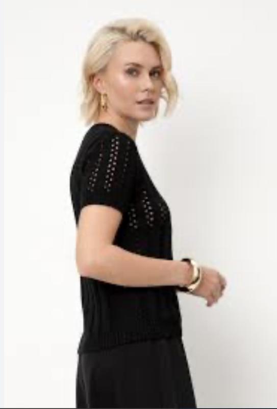 В’язаний ажурний джемпер з короткими рукавами чорного кольору в ідеальному стані. Гарно виглядає в носці як один так і в парі з білою сорочкою або лонгслівом. Пог 43 см. Ширина в плечах 35 см. Р 18 см. Д 56 см.