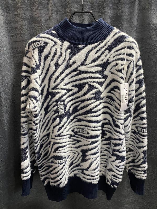 Пухнастий светр «альпака» Gertie * Дизайн: Модель має ефектний анімалістичний принт (зебра) у біло-синій кольоровій гамі. Виріб доповнений контрастною темно-синьою резинкою на горловині, манжетах та по нижньому краю. * Текстура: Матеріал має характерну пухнасту, «трав'янисту» фактуру, яку часто називають «альпака» за її м'якість та візуальну об'ємність. * Склад тканини: * 65% Бавовна (Cotton) — забезпечує комфорт та натуральність; * 20% Поліестер — додає зносостійкості та допомагає тримати форму; * 15% Вовна (Wool) — забезпечує тепло. * Рекомендації з догляду: Виробник рекомендує ручне прання або делікатний режим для вовни при 30°C без віджиму (не викручувати). Дозволено прасування при середній температурі (150°C) через захисну тканину.
