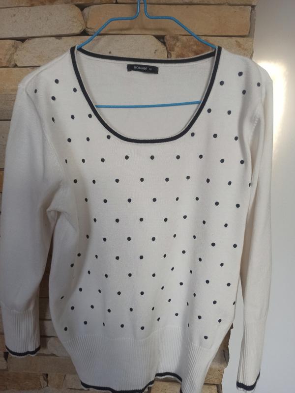 Милая кофтина белого цвета в черный горошек, принт только спереди.Есть в наличии такой же черного цвета.Размер s, замеры Н ОГ-43, длина рукава-48, длина 56, материал- 70 - вискоза, 30- полиамид.Рукавчик укороченный, 3/4