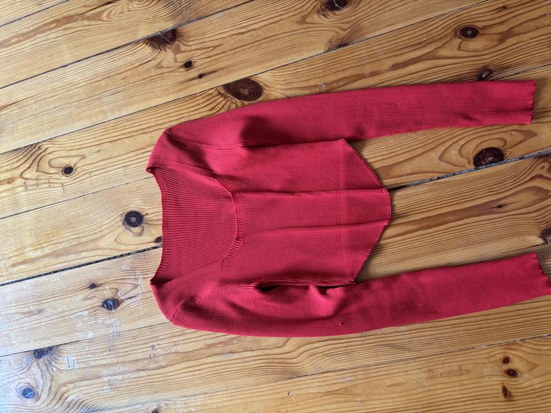 Червона укорочена кофтинка, розмір S Стильна червона укорочена кофтинка, яка ідеально підкреслює талію та доповнює сучасний образ. М’який і приємний до тіла матеріал забезпечує комфорт протягом дня. ⚠️ Дефект: на фото показано невеликий дефект, зверніть увагу перед покупкою. Ідеально комбінується з джинсами, спідницями або штанами високої посадки для модного вигляду.