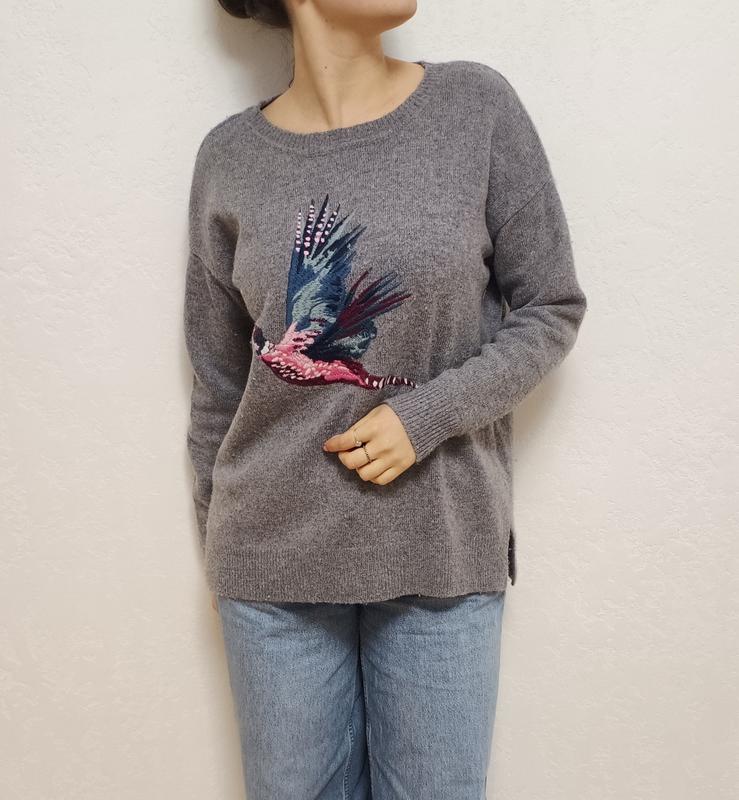 Нежный шерстяной джем привет качественного британского бренда Joules. Изготовлен он из смесовой пряжи: шерсть ягненка в сочетании с полиамидом. Полотно плотное, структурированное, упругое, очень мягкое, нежное, пушистое и абсолютно не колючее. Джемпер имеет базовый прямой крой закрытой круглой горловиной. Акцентом в нем выступает вышитая птичка: красочный фазан прекрасный детализации, который разветвит багровыми и розовыми оттенками. Особенно красиво они сочетаются с серым тоном. Лаконичная и одновременно необыкновенная вещь, которая добавит чуточку веселья вашему образу. Для примера прикрепляю официальный сайт бренда (образный джемпер будет внимачать на нем около 70 фунтов) - https:/*************************************************************** Размер: на наборе указан 40 размер, соответствующий M-L, и красиво сядет и на меньшие размеры. Замеры: ПОГ - 58 см, ПОТ- 56 см, низ - 55 см, длина - 64 см, плечи - 54 см, длина рукава - 48 см, ширина рукава - 32 см. Состав: 80% шерсть ягнята, 20% полиамид. Параметры модели: ОГ - 84 см, ОТ - 68 см, ОБ - 96 см. Рост - 170 см.