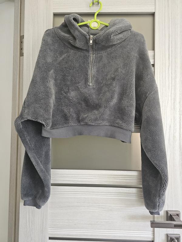 Это серая, пушистая, укороченная толстовка (худи) с капюшоном на молнии. Цвет: Серый. Материал: Пушистый, мягкий материал (имитация меха или флис "плюш"). Фасон: Укороченный (кроп-топ), с длинными рукавами и капюшоном. Детали: Присущая короткая металлическая молния спереди у горловины, а также эластичная резинка внизу изделия и на манжетах рукавов. Состояние: В очень хорошем состоянии. Назначение: женская или подростковая одежда для повседневной носки в прохладную погоду. Замеры : Об/грудь 120, длина 45 рукав 77.