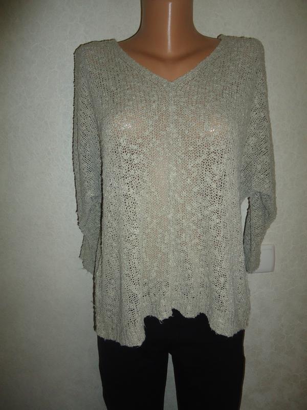 Указан размер L, думаю пойдет и на больше или, как оверсайз. Идет немного, как летучая мышь Длина - 55см, сзади - 57см ПОГ - 57-80см ПОТ - 55-71см Рукав - от шеи 52см Есть пара катышек