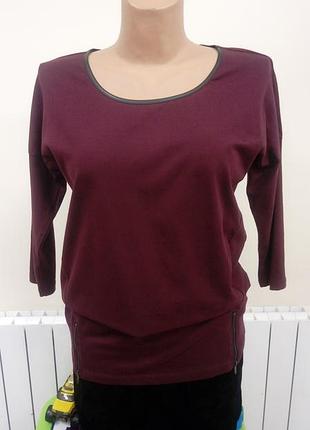 Красивый модный реглан лонгслив с отделкой искусственной кожей по вороту. Ткань - хлопковый плотный трикотаж, мягкая приятная на ощупь. Рукав - спущенный, длина 3/4. Круглый женственный вырез горловины отделан искусственной кожей, снизу и спереди две декоративные молнии. Красивый глубокий цвет марсала Самовывоз скидка 5% Код товара 13441