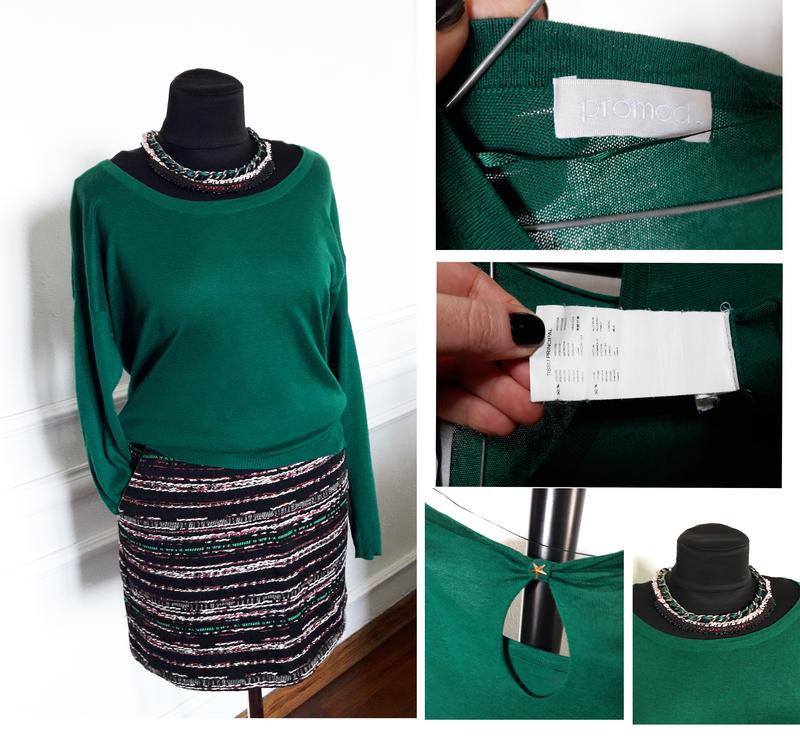 яркого изумрудного цвета кофта Promod. Покупалась комплектом с юбкой Promod. Очень приятный к телу материал, на спинке вырез "капля". носился мало. следов носка нет, зацепок нет, все швы цели. Замеры : ОГ=до 100, длина по спинке =64см. Надета на манекен размеров: ОГ=89см/ОТ=69см/ПРО=91см