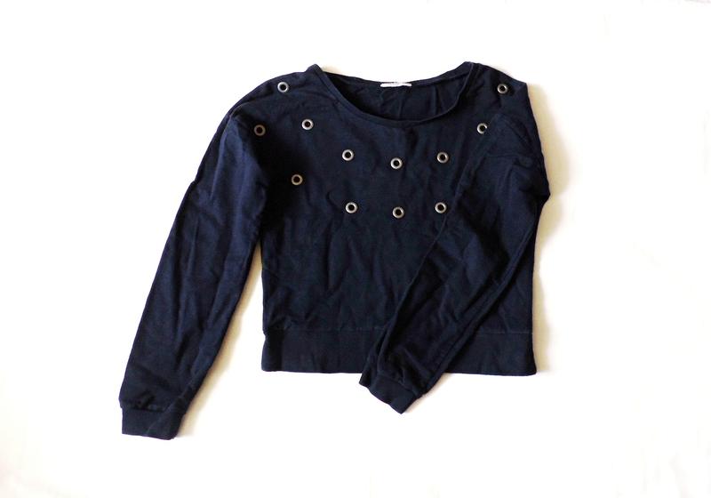 Темно-синий джемпер с металлическими сквозными кольцами, плечи чуть спущенные. Состояние очень хорошее, почти не носился - заказывала в интернете, оказался велик. Размер был указан S, но подойдет и на небольшую М. Длина - 48 см Ширина по низу - 42 см Ширина горловины - 24 см Ширина плеч - 54 см (носятся спущенными) Длина рукава - 50 см