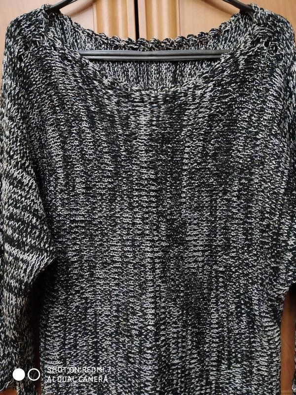 Воротничок -лодочка, нить с люрексом, по бокам завязки, рукав летучая мышь. Смотрится нарядно