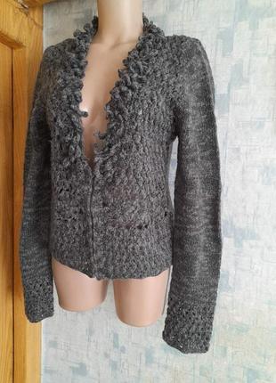 Кофта з ажуром р. 48 євр р L . Promod – французский бренд ефектно виглядає! оздоблення вирізу -в'язання "витягнуті петлі" колір-темно-зелений меланж малахіт (реальний колір на останньому фото) перед ,по низу рукава та низ кофти -ажур в'язка гачком спинка кофти та рукава - в'язані спицями застібка - гачки довжина-60 см довжина рукава-67 см пог-49 см ширина плечей - 42 см