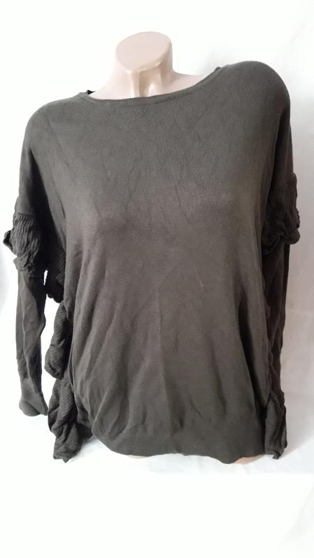Джемпер с воланами. Красивый фасон. Рукав облигает руку. Цвет хаки., вспышка искажает точный цвет. Размер 52. Ориентируйтесь на замеры. Длина 77 рукав от горловины 72 ПОГ 53-55 Спрашивайте буду рада ответить на все ваши вопросы !!! Смотрите другие мои объявления для Вас есть качественная и недорогая одежда !!!
