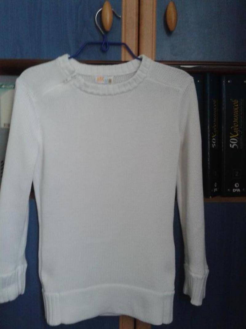 Белоснежная нарядная кофта из хлопка, рукав 3/4, сбоку замочек около горловины, указан размер М, но реально меньше,т.к. не тянется. Идеальное состояние
