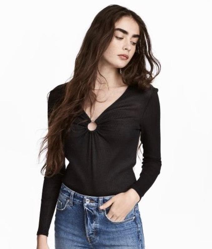 Легенький джемпер «в рубчик» з трикутним вирізом і металевим кольцом в дуже хорошому стані, трохи просвічує, 60% поліестер, 37 віскоза, 3 еластан. Розмір М( може підійти на S, див. заміри на фото)