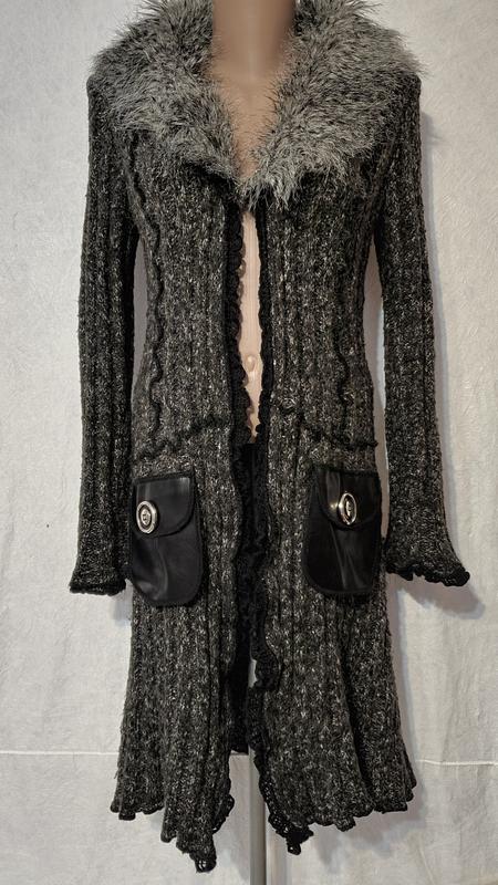 Тепла кофта, яка рятуватиме Вас від холоду. Незвична на перший погляд. У складі майже 50% lana і 8% кашемір- що робить її дуже теплою. Зручна і легка. Застібається в районі закінчення коміра на гачок. За власним бажанням можна додати пояс. Матеріал дуже добре тягнеться, але форми не втрачає. Силует приталений, до низу йде трапецією. Кишеньки робочі, накладні. Кофта у дуже хорошому стані. Розмір заявлено М. Може йти і на С. Також орієнтуйтеся по замірам: Довжина =94 Довжина рукава= 64 Пог=43 Пот= 39 Поб = вільно