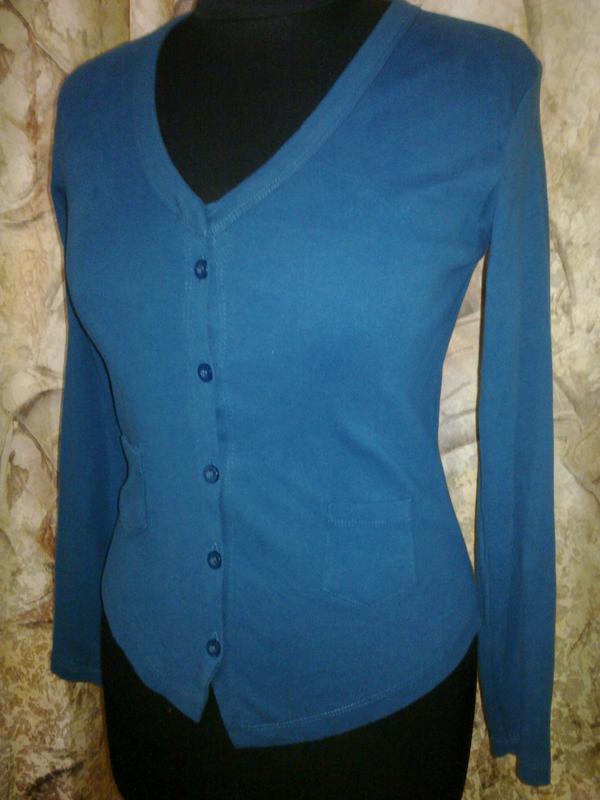 Классная кофточка, бирюзового цвета, цвета "морской волны", имеет стильный, облегающий, укороченный фасон, с ассиметричными полами-углами. Застегивается на однотонные пуговки, с гравировкой названия фирмы, имеет вырез-мысом с трикотажной отделкой, по низу, по боках имеет два накладных, фигурных карманчика. Изготовлена английской фирмой, из 100%коттона, приятный, мягкий, натуральный трикотаж, вязанный мелкой резинкой, которая немножко тянется. Размер 44-42, набирке указано М-раз., но маломерит на S-раз. состояние отличное, как новое. РАЗМЕРЫ: ПОГ.=42см, ПОТ.=37см, ПОБ.=42см, Длн.издл. по спинке=50см, спереди, по углам=60см., Длн.рукв.=57см, Шир.плеч=37см. ЛОТЫ КОМБИНИРУЮ!!!
