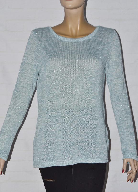 Приятный джемпер кофта не плотной вязки с не большим вкраплением люрексовой нити. Цвет нежно голубой меланж. Новое, с биркой Нюанс: есть несколько затяжек, самая заметная спереди, показано на последнем фото. Остальные с лицевой стороны не видно. Замеры: Плечи: 41 см ПОГ: 48 см ПОТ: 47 см Длина: 67 см Длина рукава : 66 см