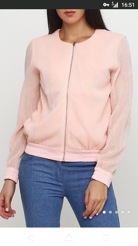 Светло - розовы й бомбер декорирован пайетками, спереди прорезные карманы. На размер S длина изделия 56 см, длина рукава 64 см. Состав: 65% вискоза, 35% полиэстер.