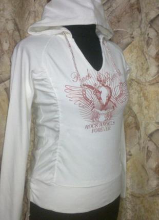 Классная, теплая кофточка. типа "толстовки", белого цвета, приталенная, с капюшоном, на завязках, белого цвета с красным люрексом. Вырез мысиком, на груди, имеет рисунок, нежно-красного цвета. Рукава-регланы. По боках, имеет драпировку, по боках, на манжете. по низу,, есть стяжка, из такой же шнуровки. как завязка на капюшоне. Изготовлена брендовой, немецкой фирмой CANDA, из 100%коттона, приятная. теплая, с легким начесом, натуральная, трикотажная ткань. Размер М/L, состояние очень хорошее. РАЗМЕР: ПОГ.=48см, ПОТ.=43см, ПОБ.=49см, Длн.издл.=59.5см, Длн.рукв. от подмышки=50.5см, Шир. плечей=42см. ЛОТИ КОМБІНУЮ!!!