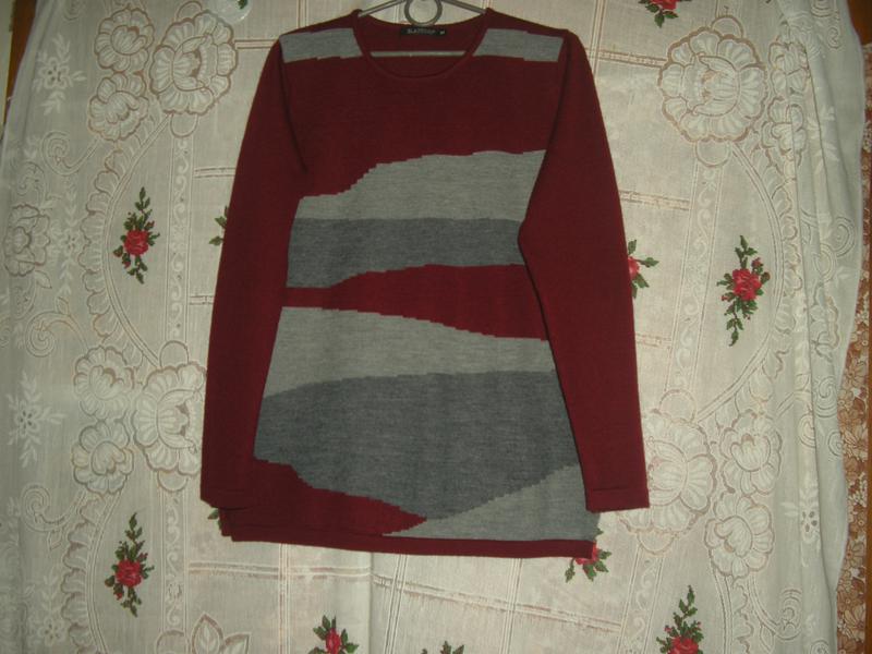 Шикарная теплая,фирменная кофта вишневого цвета,впереди красивая аппликация светло и темно-серого цвета,внизу по бокам разрезики,объем груди-104см.,длина рукава-57см.,длина кофты-65см.