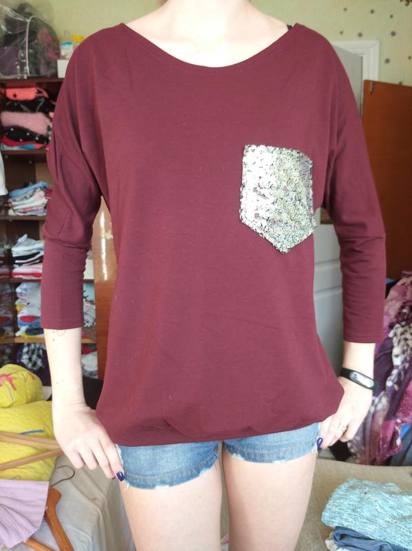 оверсайз, кишеня з паєток, тканина досить щільна. довжина 64, рукав летюча миша від ворота 56 см , ширина внизу 44, в районі грудей 54