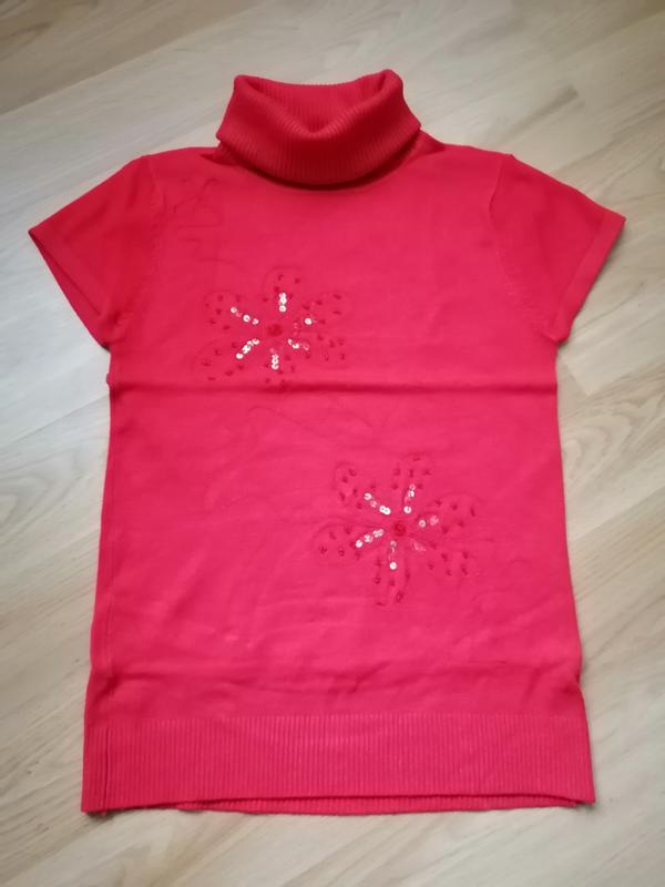 Симпатичная яркая кофточка, по составу 90% шерсти, тонкая мягкая, расшита бисером и пайетками. Спинка 54 см, ворот 17 см, плечи 33 см, рукавчик 12 см, подмышки 38 см, низ 36 см, манжет 5,5 см.