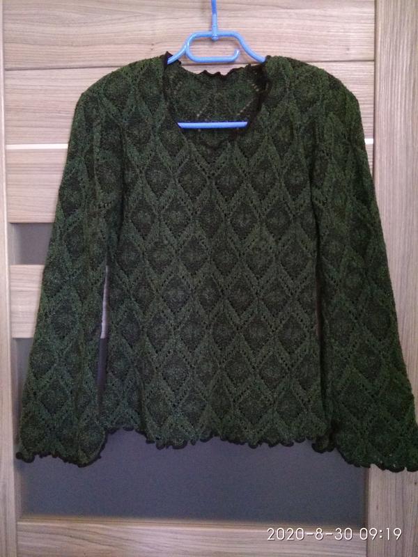 Мягкий, приятный, не колется. Длина по спинке 55 см. длина рукава 55 см.