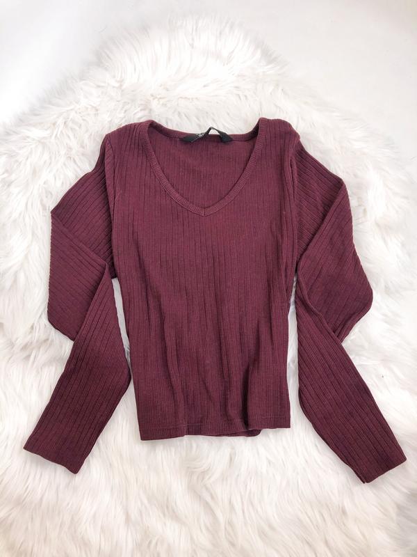Базовий джемпер, в ідеальному стані, як новий, в рубчик, бордового кольору, з довгими рукавами, в складі є 58% бавовна, якість-чудова! Розмір: XXS/XS/S