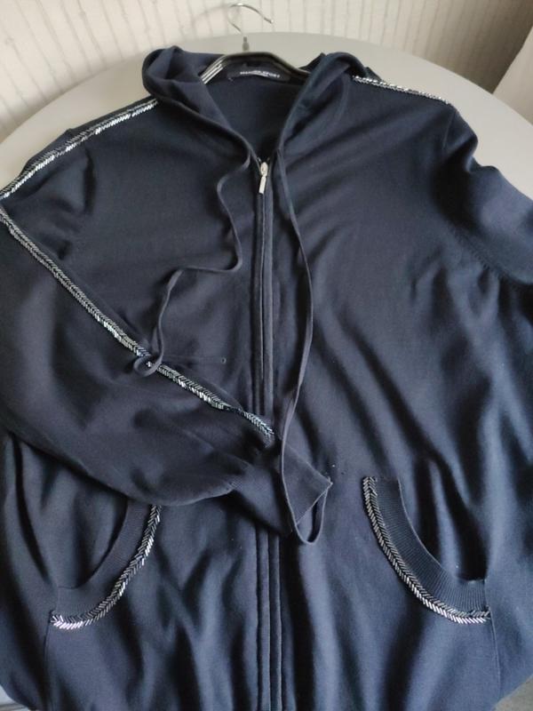 Спортивний джемпер Marina Rinaldi класу Lux дуже приємний, гарний варіант для спорту і щоденного користування. Є капюшон, кишені кенгуру, красива вишивки чеським бісером перед покупкою звіряйте виміри Ширина 53, внизу гумка 42, довжина рукава 60, від капюшона до рукава плече 12, довжина виробу 63