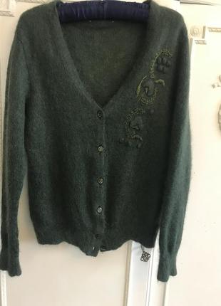 Гарний тепленький джемпер/кофта. Застібка на гудзиках, колір-темно-зелений. На лівій поличці красива вишивка гладдю в тон . Без бірочка, але по відчуттях однозначно є мохер і шерсть. Дуже затишне і тепленьке виріб. Заміри:довжина-58 см, ПОГ-51 см, ПОБІДИ -37 см, рукав-58 див. Відмінно на наш 46