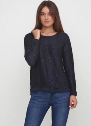 Стильний джемпер з шифоновою вставкою прикрашений пайєтками від Esmara. Ширина плечей 34 див., довжина рукава 62 див., довжина джемпера 67 див., напівобхват грудей 47 див.