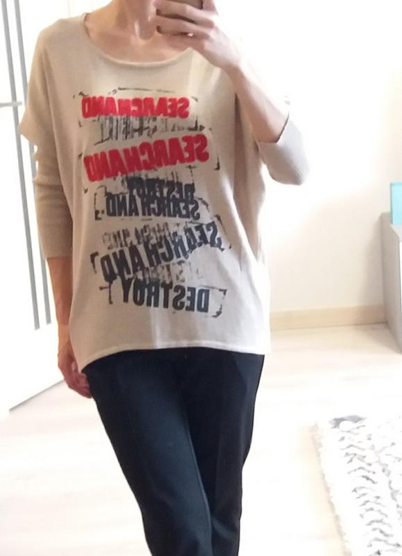 Свободная туничка, размер univers . Красивый бежевый цвет теплого оттенка. Сзади джемпер идет немного длиннее. замеры: Длина спереди-64cм. Длина сзади-72cм. Длина рукава-3/4 Полуобхват подмышек-79см. Полуобхват по низу-48см Идеальное состояние. На фото одета на параметры 84-65-93 Состав:70 хлопок 20 шерсть 10 полиэстр