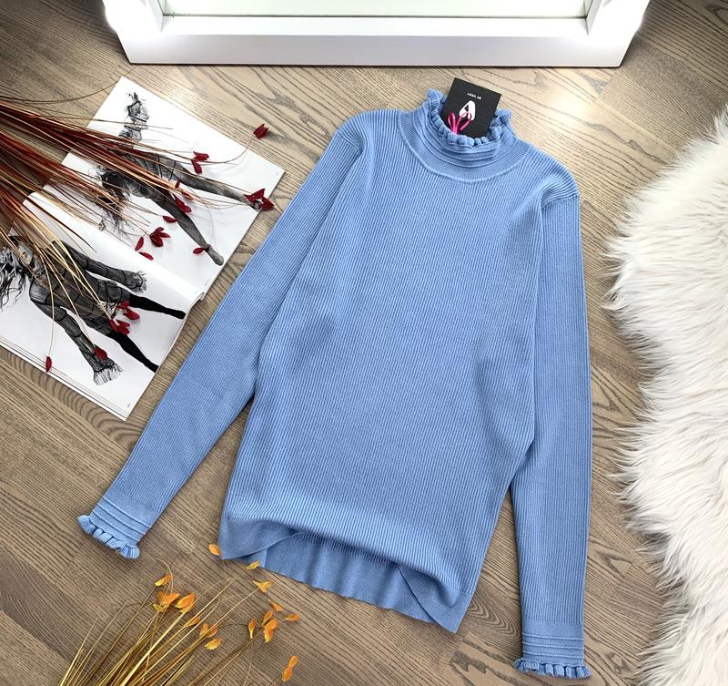 Интересный гольфик V by Very Ткань в рубчик, плотная, не просвечивает. На рукавах и горловина фактурной вязки по типу рюш. В составе вискоза и нейлон. Размер указан UK24, но в реальности подойдёт для L/XL/XXL. •ПОГ 51 см; •Длина 67 см; •Рукав 63 см.
