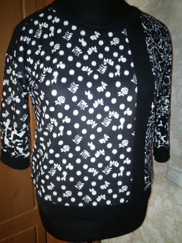 длина 64см рукав 38см(хорошо за локоть)ПОГ 60см++ ПОБ 61см Ткань мягенькая тянется приятная средней плотности не мнется Вещь без постороннего запаха и готова к ношению Сочетание разных принтов черно-белых.В общем все в меру-ненавязчиво-с шиком Вещь универсальная-и в мир и на пир Манекен 56-58 размера-как раз