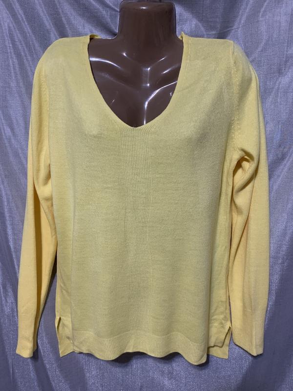 Однотонный джемпер с боковыми разрезами и треугольной горловиной. Замеры: длина - 70/73см., плечи - 41см., рукав - 68см., ПОГ - 53см., ПОТ - 50см., ПОБ - 53см
