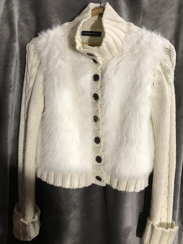 Вязаная кофта бело-кремового цвета со вставками меха .70% акрил;30% Лайн-шерсть.Длина от плеча до низа 45 см;длина плеча 9 см;ширина(спины)48 см;длина рукава 63 см в подвёрнутом(71 см полная длина)