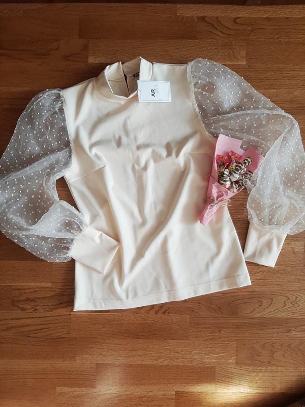 Розмір 46(L) Український бренд Аржен Колір молочний трикотаж (85% полиестер,10%віскоза,5%спандекс) Довжина 62 см Довжина рукава 71 см Ширина 46 см
