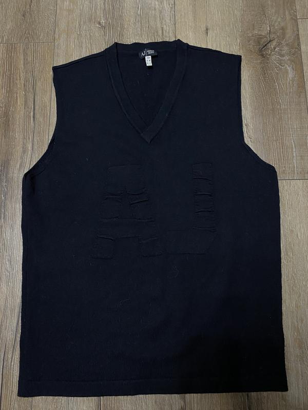 Базовая вещь-классический жилет известного бренда, оригинал. Куплен в аутлет (Италия). Очень стильно с белой рубашкой. Спереди узор из двух букв AJ (Armani Jeans). Очень тёплый. Состояние идеальное.
