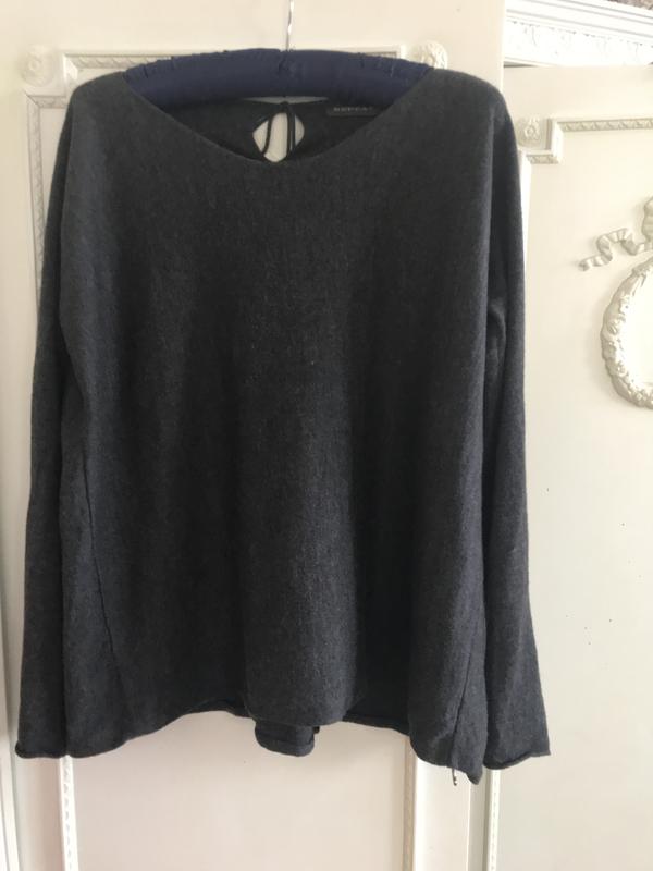 Стильный шерстяной джемпер от бренда Repeat. Очень интересный крой, горловина -небольшая лодочка, сзади по центру завязывается на длинный шнурок {образуется»капелька». Очень женственно. Рукав спущенный, крой-свободный. Состав:шерсть-100/, размер по бирке -40. Есть нюанс:две рядом небольшие зацепки{дырочки}-расположены на спинке в самом низу изделия.-нужно аккуратненько затянуть. Все учтено в цене. В остальном -изделие высочайшего качества.
