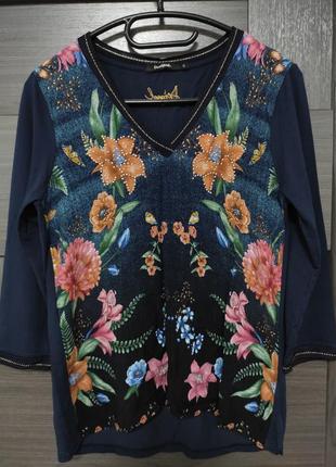 Женская кофта блуза Desigual Размер S a - 59 cm, сзади 62 cm b - 41 cm c - 50 cm d - 31 cm Материал: 97% вискоза, 3% эластан. регулярная посадка Узор: цветочный Вырез: V-образный вырез. Рукав: рукав 3/4 Символ стирки: стирка при 30 ° C или ниже Цвет: темно-синий Скрытых нюансов нет👍👍👍😉
