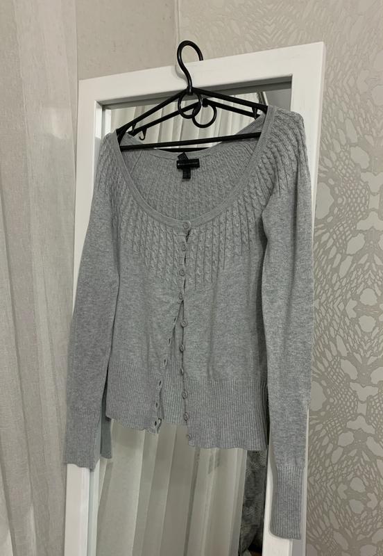 Проштовхни кофту фірми Mango округлий Виріз глибокий Застібка - гудзики Стан - добрий Колір - сірий меланж Матеріал - трикотаж Розмір - s Довжина виробу - 53 см Довжина рукава по внутрішньому шву - 53 см Довжина в плечах - 42 см