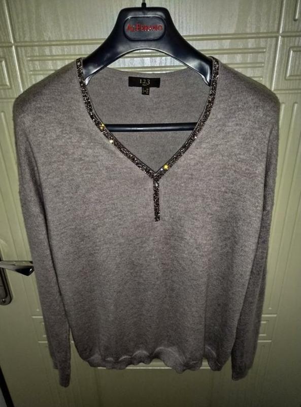 Очень красивый джемпер, качественный натуральный состав будет обеспечивать приятнейшую мягкость к коже в носке. Отделка заслуживает отдельного разговора, камера не передаёт КАК и НАСКОЛЬКО она блестит и мерцает при попадании на камушки источников света (притом не важно это дневной свет или искуственный). На фото одета на размер L, но классно смотрится и на размер S/M 🤗это проверено. Новое без бумажной этикетки