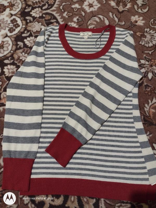 Тонка кофта з двома видами смужки: тонкою і ширшою. З розрізами по боках, з бордовими манжетами. Хороша річ на теплу погоду, адже весна не за горами! Виміри: п/о грудей - 44 см, рукав від горловини - 72 см, довжина - 66 см, плечі - 42 см.