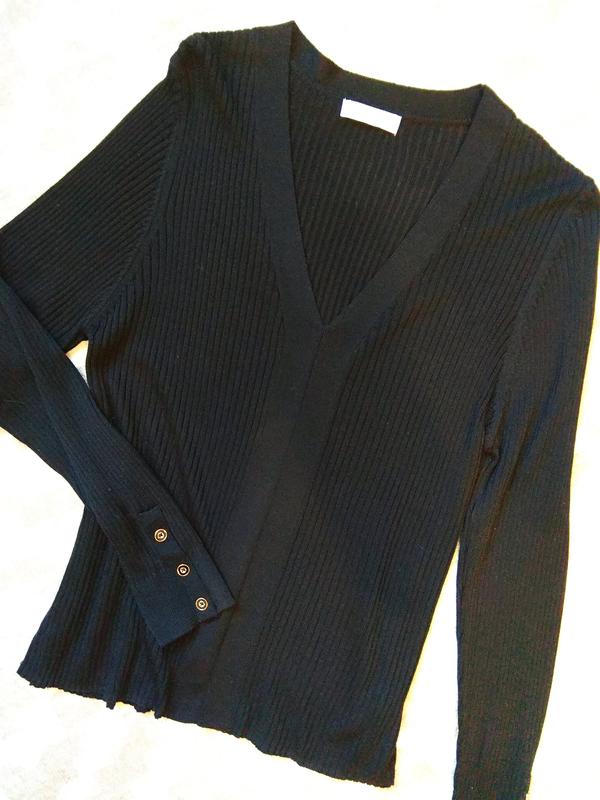 Очень классный и качественный джемпер с в-образным вырезом и пуговками на рукавах. Отлично стройнит за счёт трикотажа- лапша. Длина 66, рукав 66, ПОГ (максимально) 56. Хорошо тянется. Ткань натуральная (вискоза), не липнет мусор к ткани, цвет глубокий черный, не кашлатится. Состояние нового (брала себе, оказался велик).