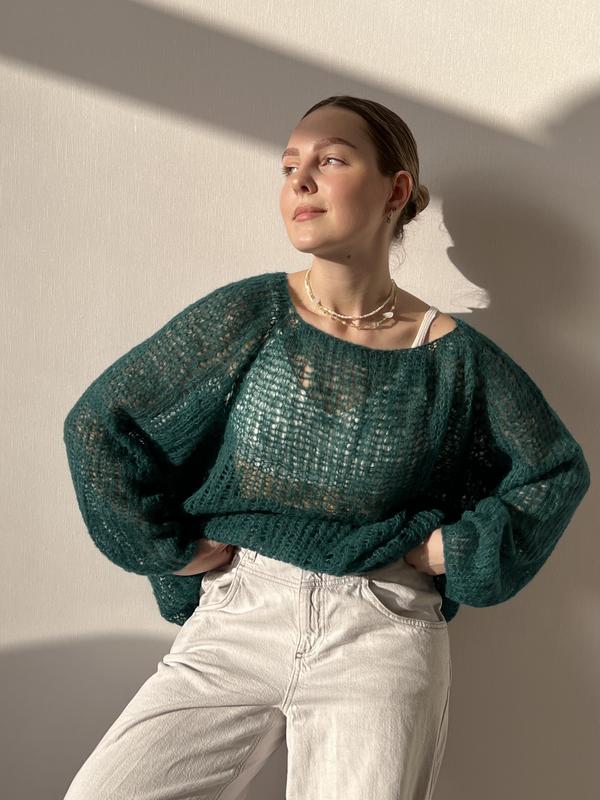 Павутинка в красивому смарагдовому кольорі. Вільний силует, повітряна текстура, стане відмінним доповненням вашого образу. Склад: 75% baby альпака, 25% шовк.