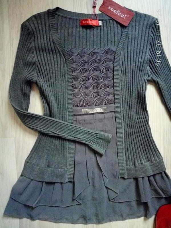 Оригинальная трикотажная комбинированная кофточка с длинными рукавами, открытрй горловиной, красивым кружевныс передом и низом с двойным шифоновым рюшем. Размер указан XXL, но подойдет и на М/L/XL. Новая. Фото на фигуре нет!Смотрите все мои предложения, много одежды, обуви и аксессуаров с Европы.