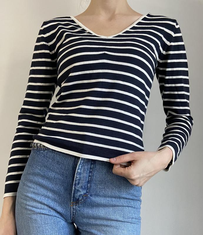 Синий в полоску джемпер, с небольшой сборкой на груди. Размер m